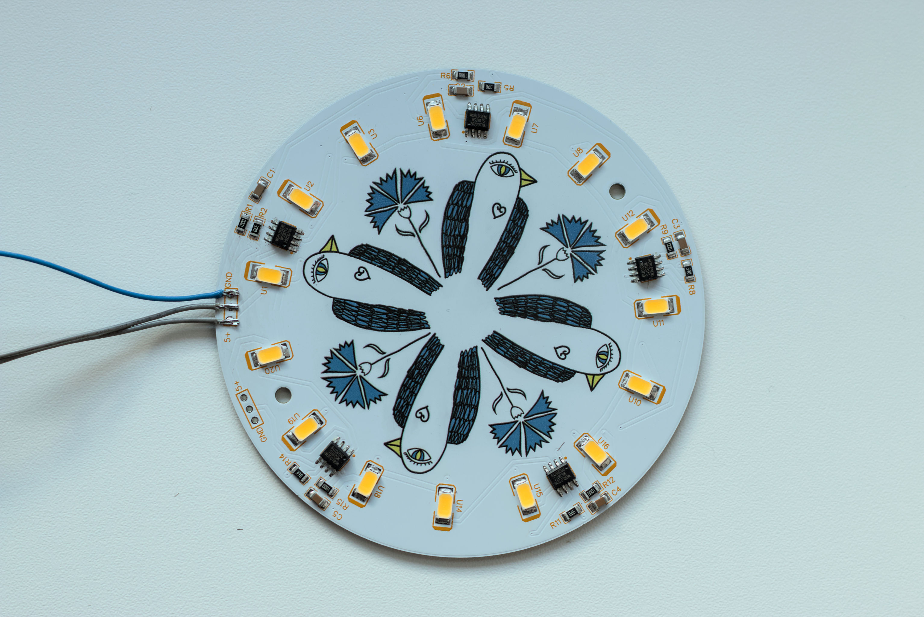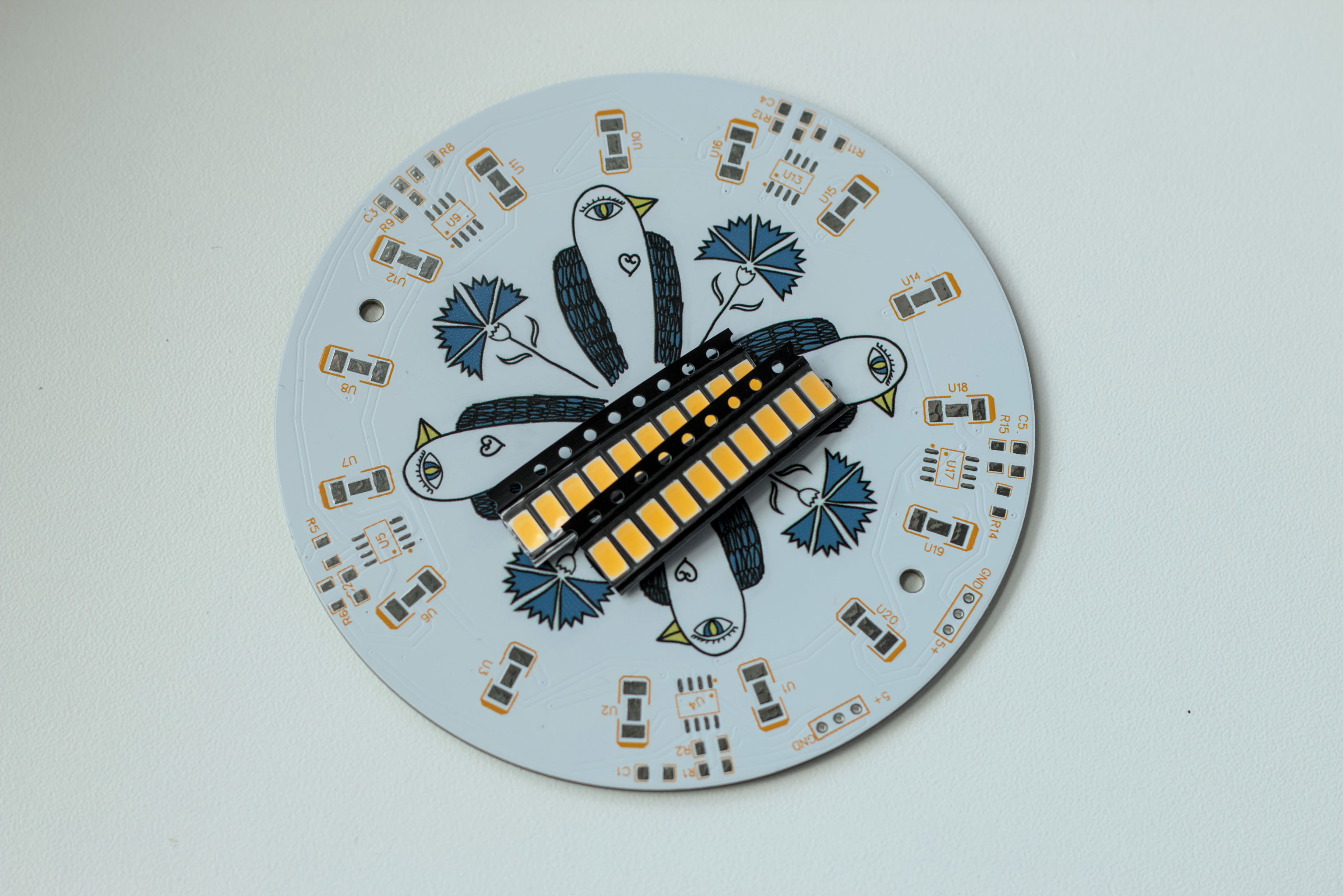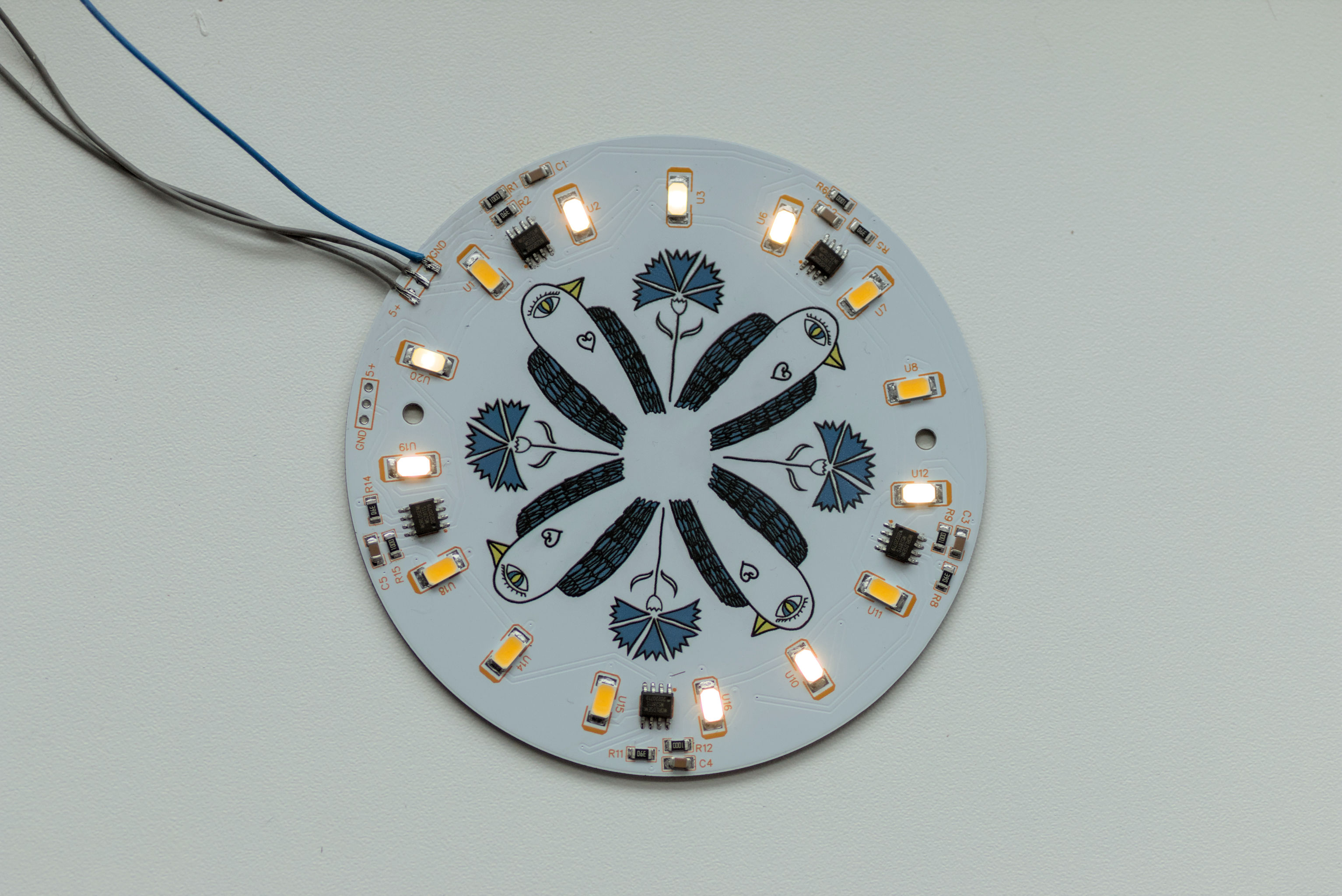 Üks LED valgusti 15 LEDiga. LEDe juhitakse läbi WS2811 kiipide, mis lubab kõikide LEDide heledust kontrollida individuaalselt. Tahaküljele saab kinnitada ka Seeedstudi XIAO arendusplaadi. Või siis kontrollida eraldi oleva mikrokontrolleriga. Mina kasutan siin ESP32te. Neid valgusteid saab ka järjestiku mitu tükki üksteise järgi. PCBd valmistas ja printis PCBWay. Komponendid jootsin ise. PCB läbimõõt 10cm.