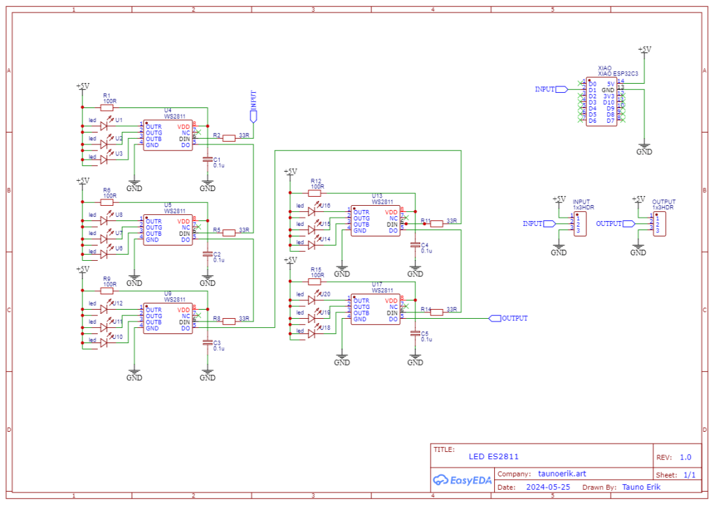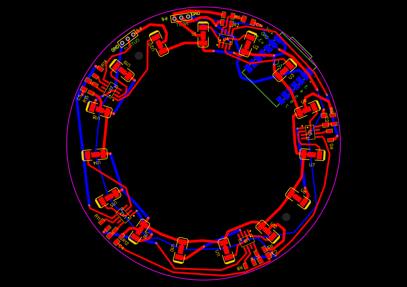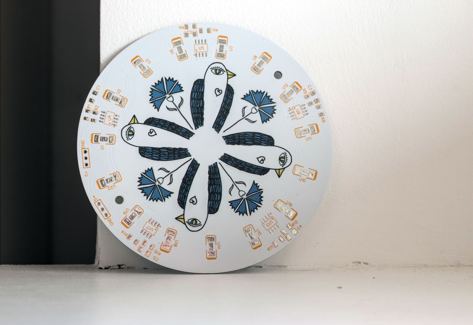 Üks LED valgusti 15 LEDiga. LEDe juhitakse läbi WS2811 kiipide, mis lubab kõikide LEDide heledust kontrollida individuaalselt. Tahaküljele saab kinnitada ka Seeedstudi XIAO arendusplaadi. Või siis kontrollida eraldi oleva mikrokontrolleriga. Mina kasutan siin ESP32te. Neid valgusteid saab ka järjestiku mitu tükki üksteise järgi. PCBd valmistas ja printis PCBWay. Komponendid jootsin ise. PCB läbimõõt 10cm.