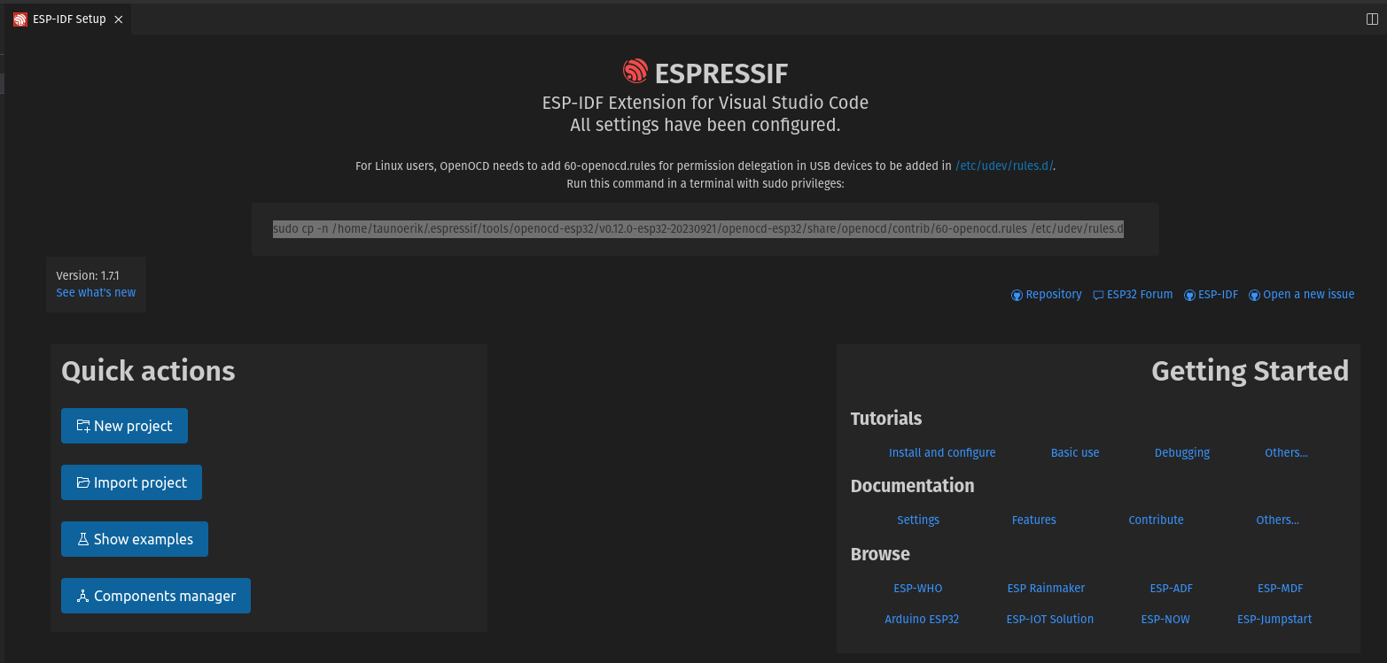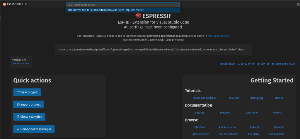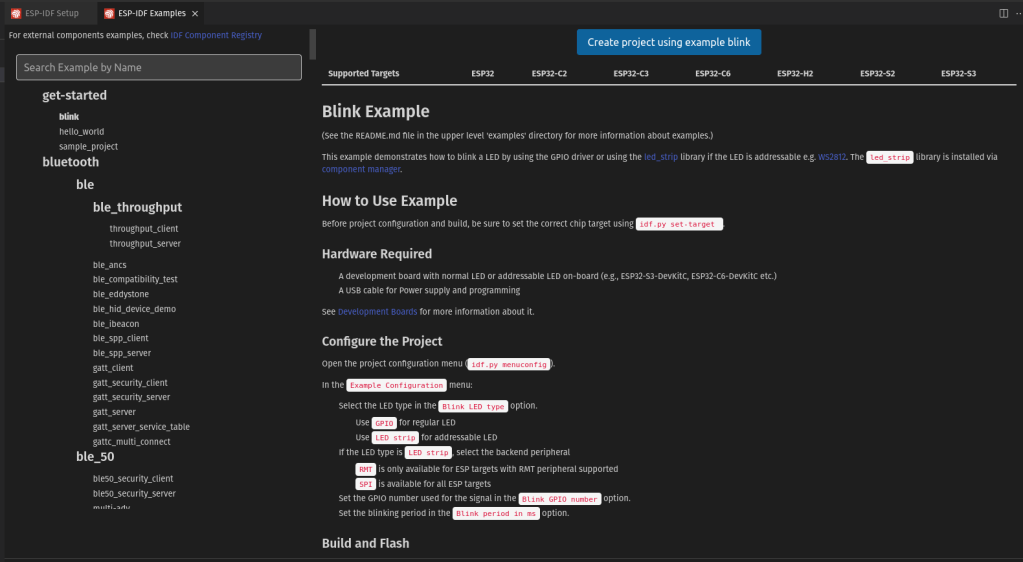Select an Espressif target (esp32, esp32s2, etc.) with the ESP-IDF: Set Espressif Device Target command. Default is esp32.