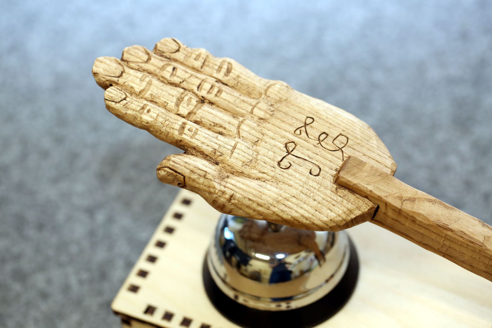 First finished prototype. Made by TSENTER. The material is MDF, painted white. The front panel (and other details) are printed in green.