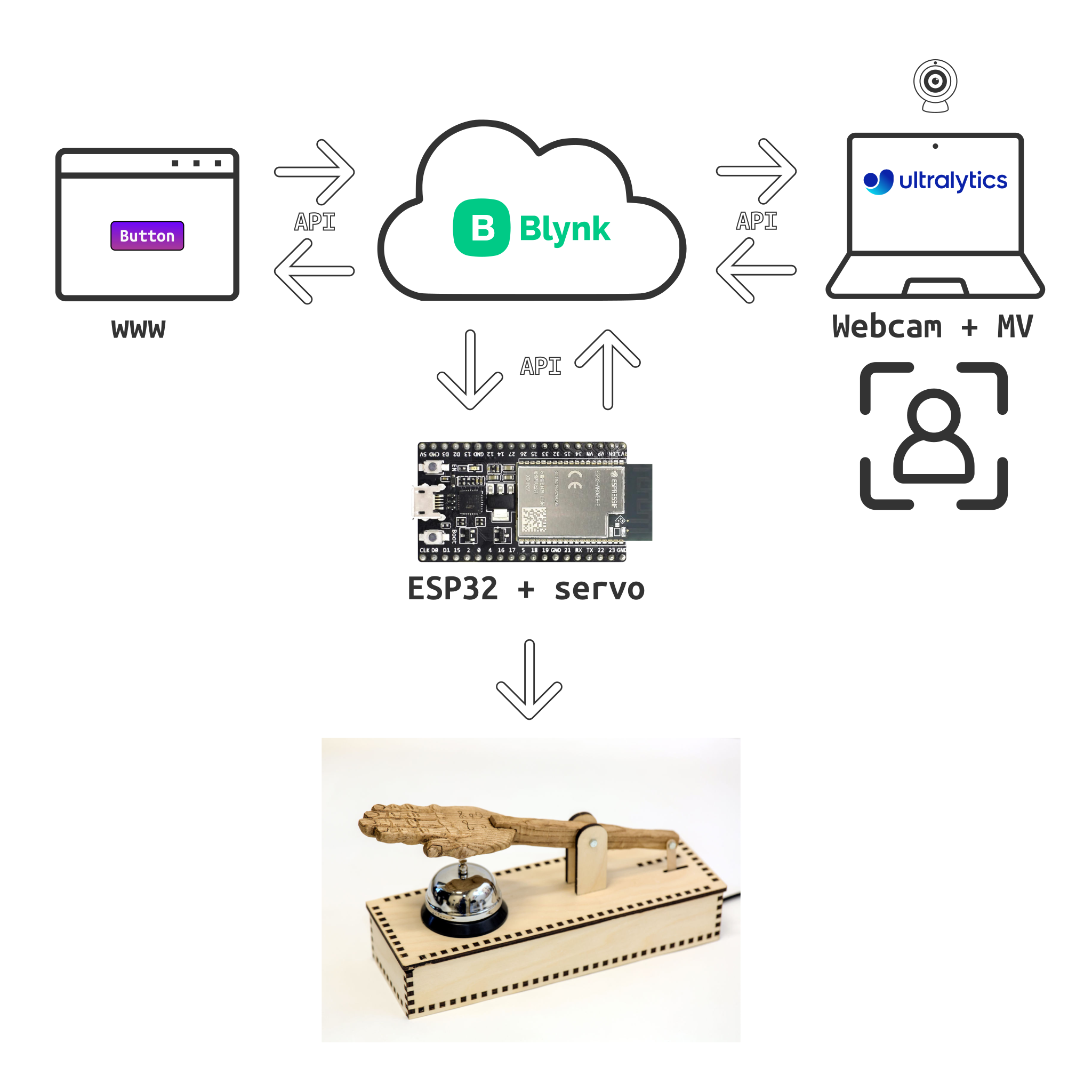 Automated System: Using an old laptop with a webcam, I developed an automated system powered by a Python script utilizing the Ultralytics machine vision library. The system detects objects like people, cups, or other items, and when a match is found, it sends a signal to activate the bell.
