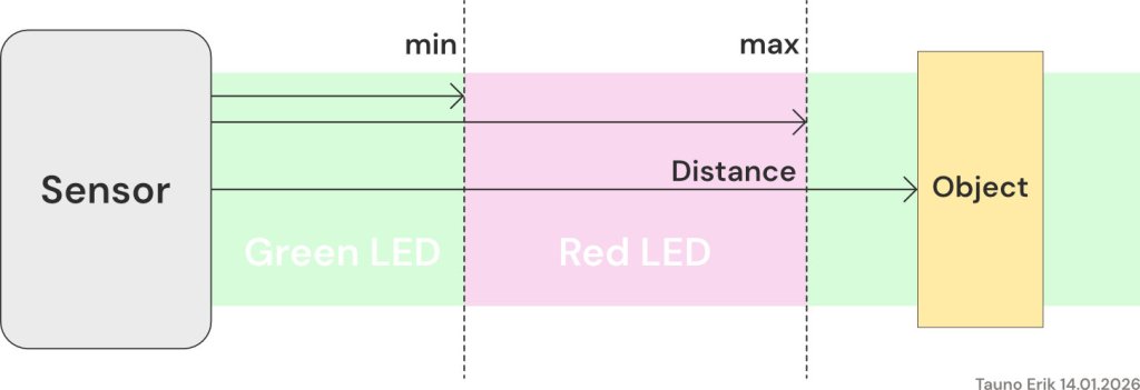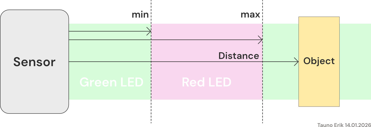 The working principle of the sensor. The left cnob is to set the min. distance and right one set the max. distance. When the object is between min and max, then the output signal is in the ON state, and the red LED is on.