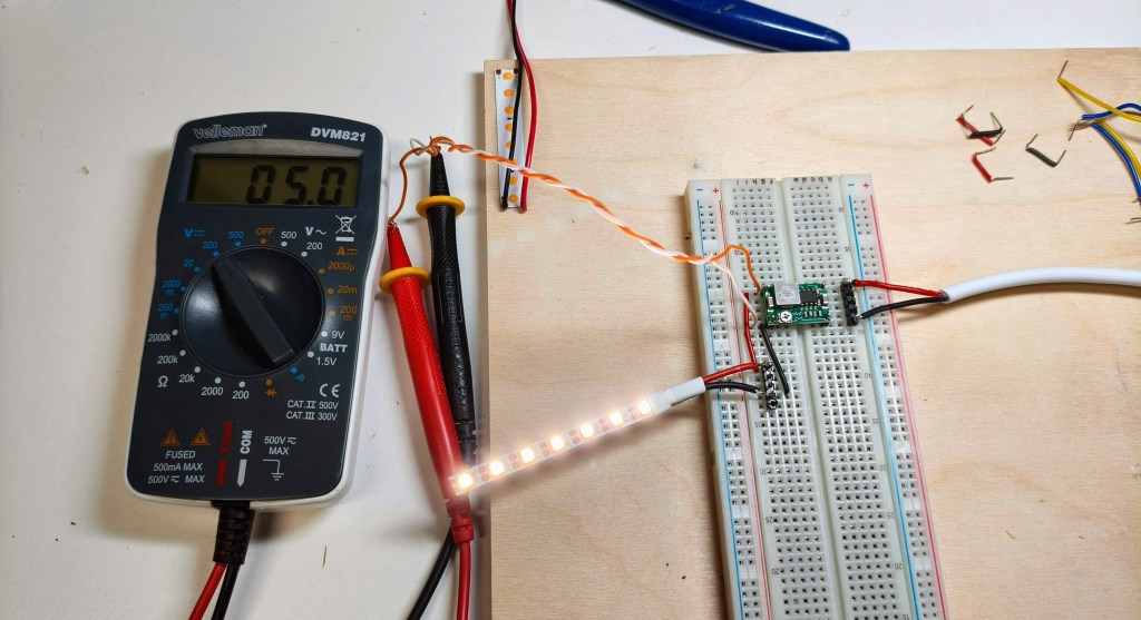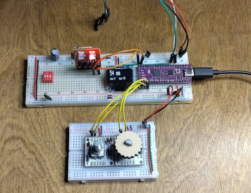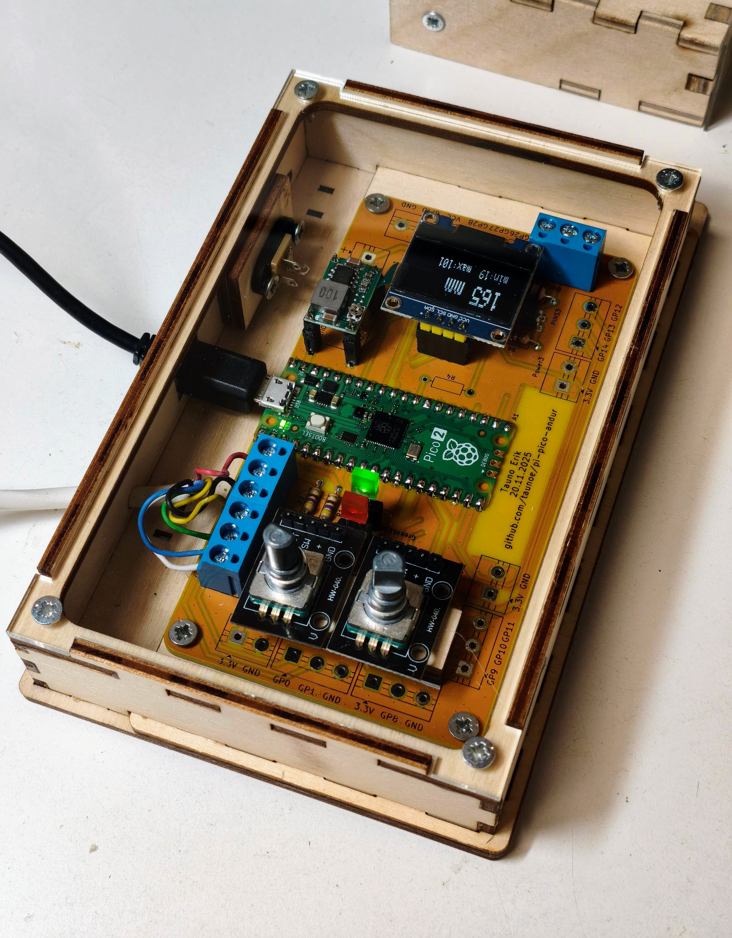Because the Raspberry Pi Pico input voltage is 1.8V to 5.5V, I needed to configure the power module to the right output voltage. I use the OKY3504-1 DC-to-DC step-down converter. The input voltage is 24V, and the output is 5V.