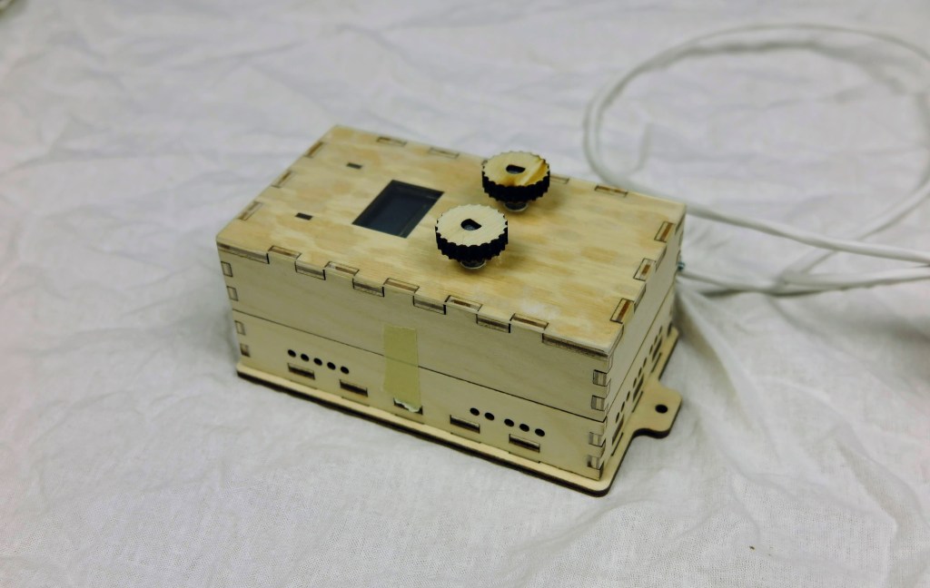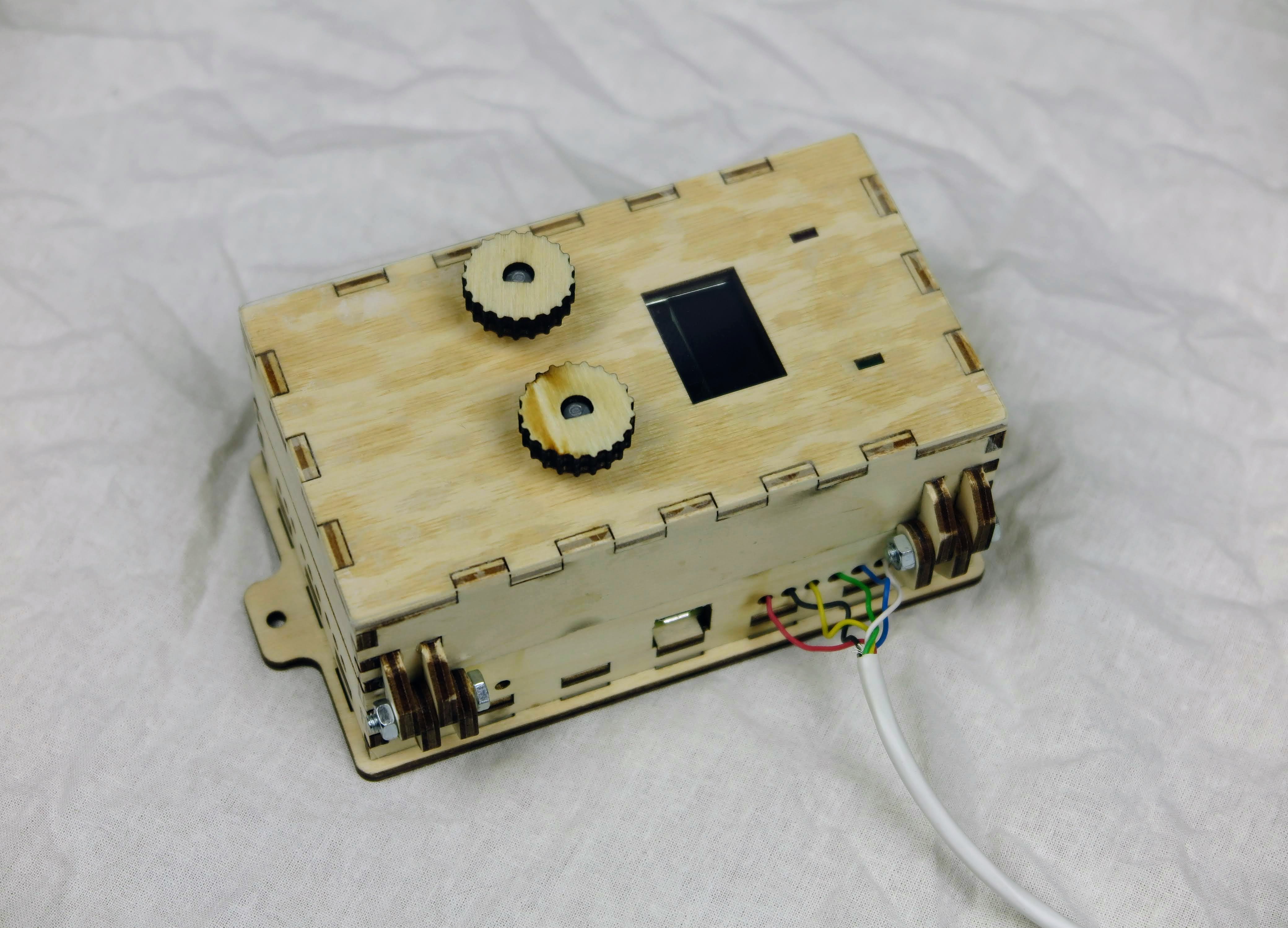 Project box at opened state.Project box at closed state. On the right is the sensor cable.Project box with a screen and rotary encoders.