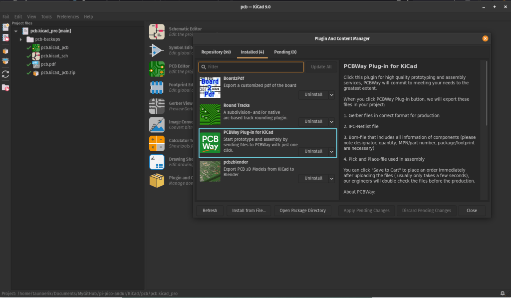 KiCAD has a plugin that allows you to quickly upload files to PCBway and place an order. You can directly install it from the KiCad Plugins window. Search “PCBWay”. It makes the ordering process simple. You don’t have to worry about whether you added all the layers and files. I ordered 10 yellow PCBs with a black silk screen. The yellow silk screen is not as bright as I like. But not bad. I like the board colour where there is no copper layer. Maybe next time I order one without copperfill.