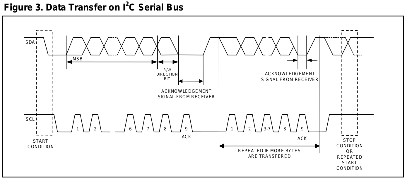I2C serial interface. Slave device. Operates in the standard mode (100kHz) only.