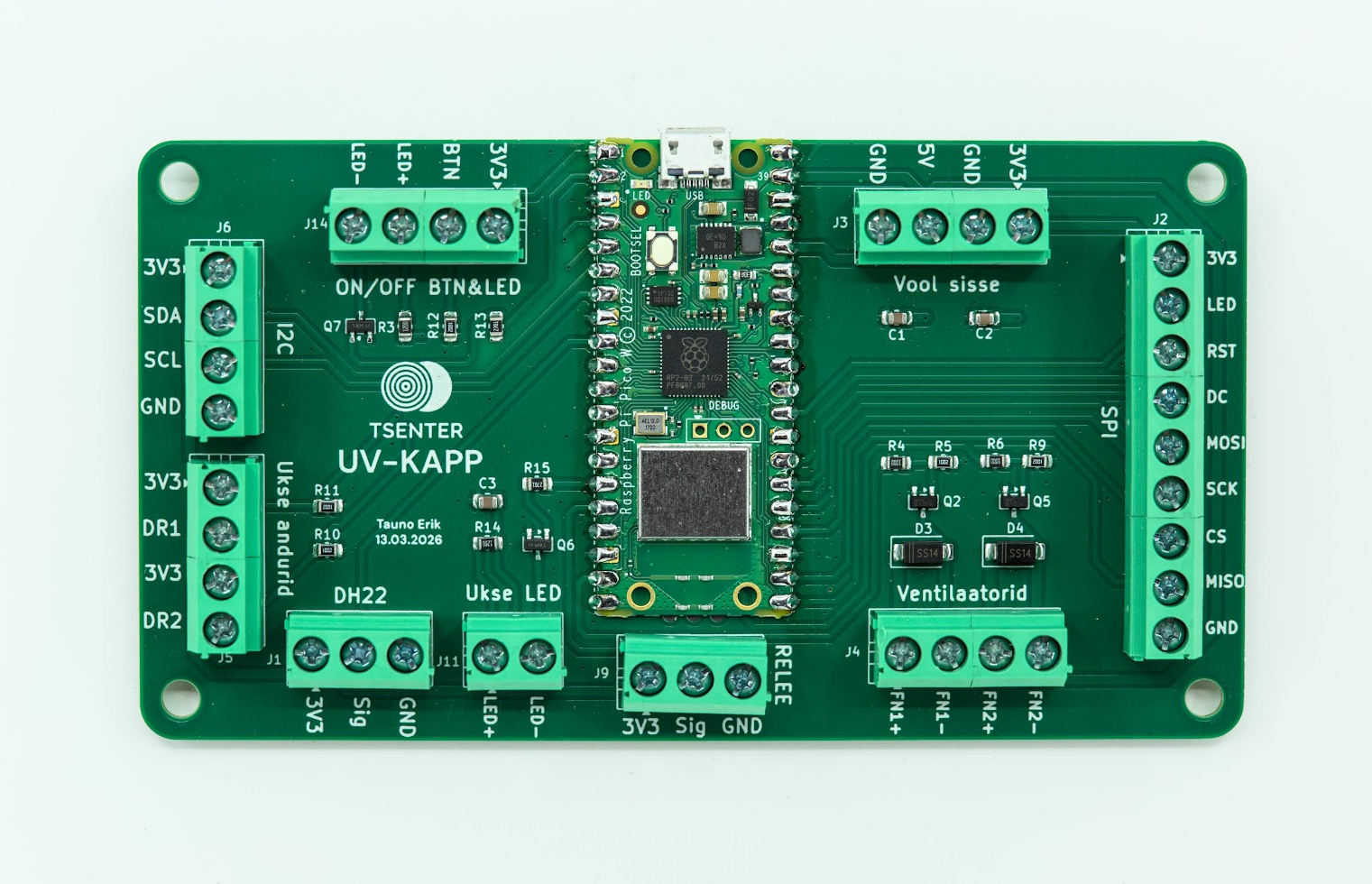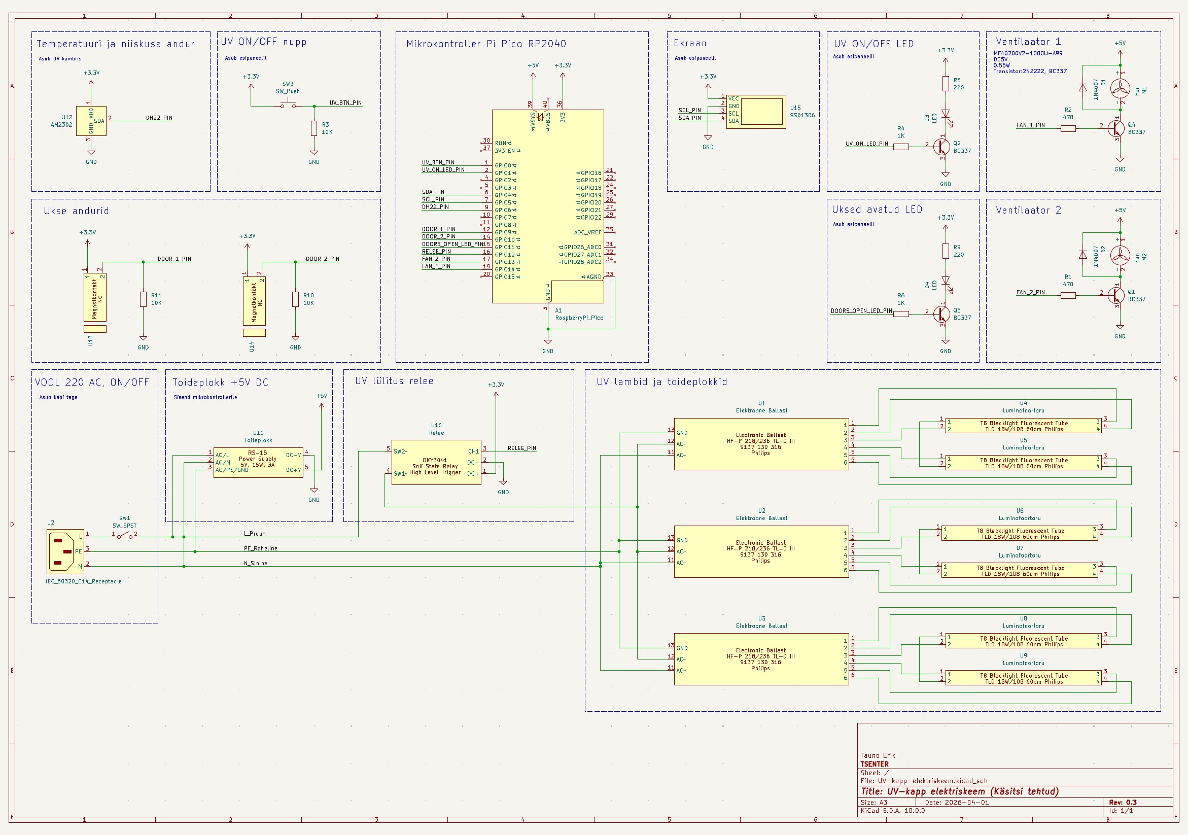 There is one ballast for every two UV lamps. UV lamps operate on 230V alternating current (AC). The second 5V power supply is for the controller. It has a solid-state relay that turns the UV lights on/off using a microcontroller. I use Raspberry Pi Pico 2 W. The plan is to add a web interface in the future. It has a DHT22 temperature and humidity sensor. It is inside the UV chamber. Also, it has a control circuit for the fans (5V). I also added door sensors to automatically turn off the UV light when someone opens the doors.