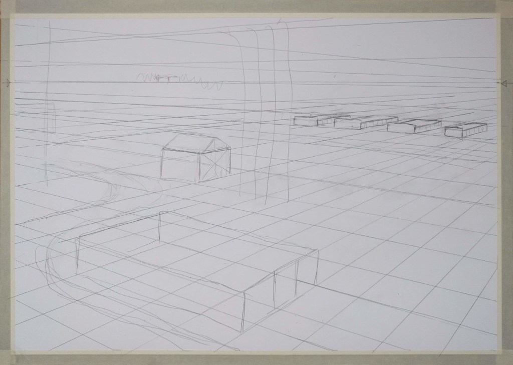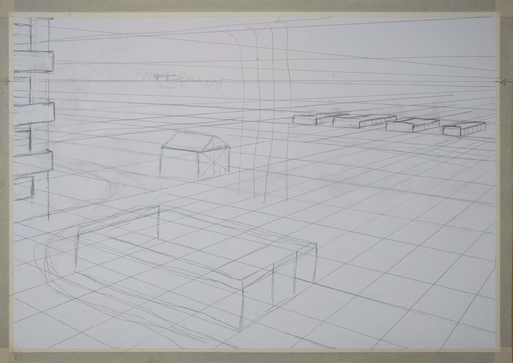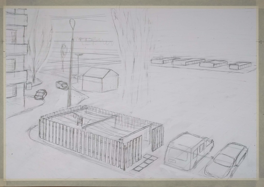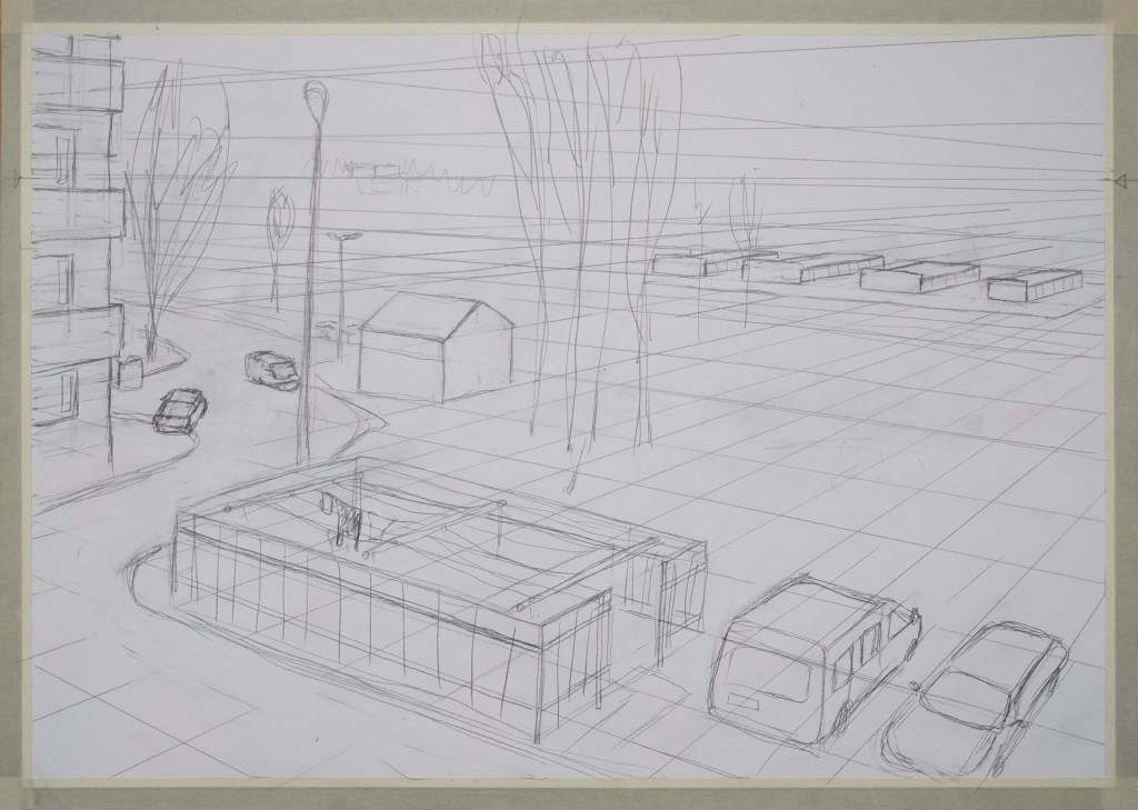 Kuivava pesuga tööl on väga ilus lippaia osa! Ma soovitaksin sul seda pilti veel pisut edasi joonistada: Vaata maapinna hele-tumeduse skaalat. Mis on selle aknavaate kõige tumedam pind või ala? Mis võiks olla kõige heledam osa tööst? Hetkel tunduvad kaks tagumist autot pisut liiga väiksed võrreldes vasakpoolse maja akendega. Vaata üle ka tagumise tänavalambi kõrgus. Joonistuse keskplaanil olev väike majake mõjuks ruumilisemalt kui üks seintest oleks tumedam, või vähemalt oleks erinevus katuse ja seinte toonis. Ma päris hästi ei saa aru, mis on need risttahukad seal tagaplaanil, paremal, aga nende tugevad, kontrastsed piirjooned tõmbavad need ehitised visuaalselt liialt ette. Võrreldes tunduvalt eespool olevate puudega võiks kaugemad ehitised olla õrnemad, heledamad. Tahaksin, et sa valiksid selles pildis välja midagi, mida rõhutada, otsustaksid, mis on kõige olulisem.