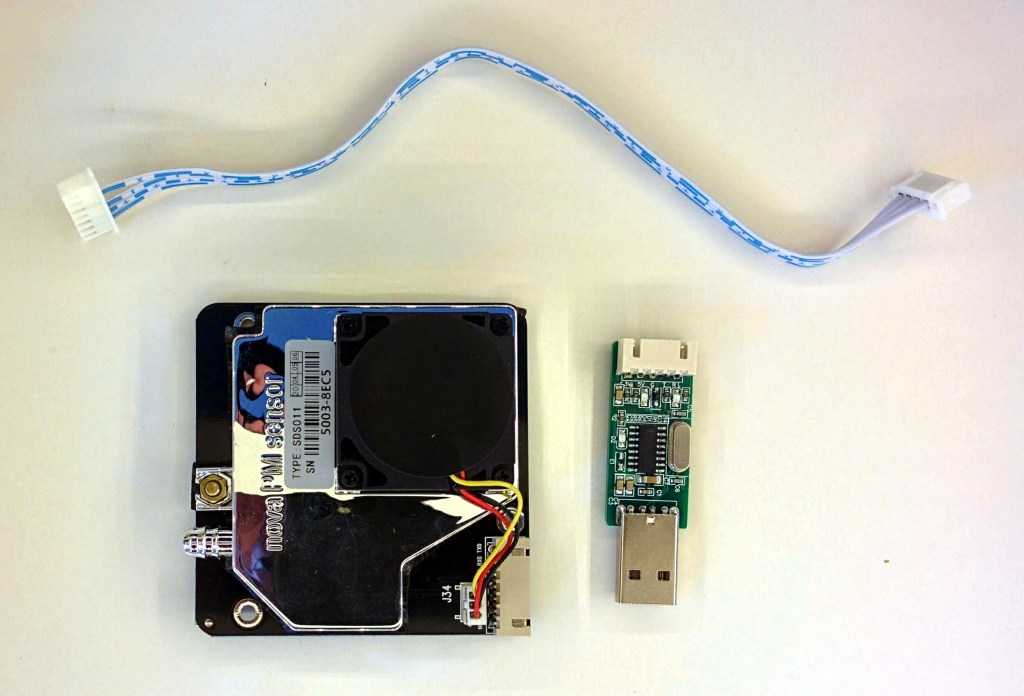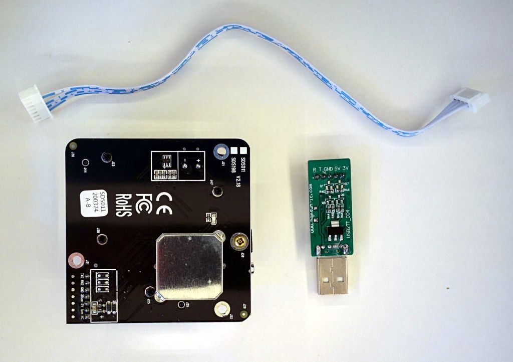 SDS011 package includes sensor, cable and serial adapter module (USB to TTL). I got mine here: https://www.digitspace.com/sds011-air-quality-sensor-module?2e40f3ca70399010