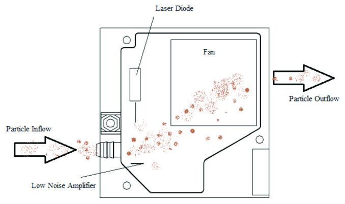 The sensor is designed with a built-in fan to ensure sample air circulation to a chamber with a laser diode, where the size and amount of PMis determined. The scattered light is transformed into electrical signals and with further analysis, on the signal waveform, the digital output of the component is the particle concentration of PM2.5 andPM10 (from counts of particles with diameters from 0.3 to 10μm). The working principle is based on light scattering, where a light source illuminates the particles and the scattered light is transformed into a signal by a photodetector, the amplitude of which depends on the light wavelength, scattering angle, particle size and relative index of refraction between medium and particle. (3)