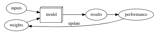 - Igal mudelil on kaks sisendit: 1. andmed (inputs) ja 2. mudeli parameetrid/ kaalud (weights, model parameters).