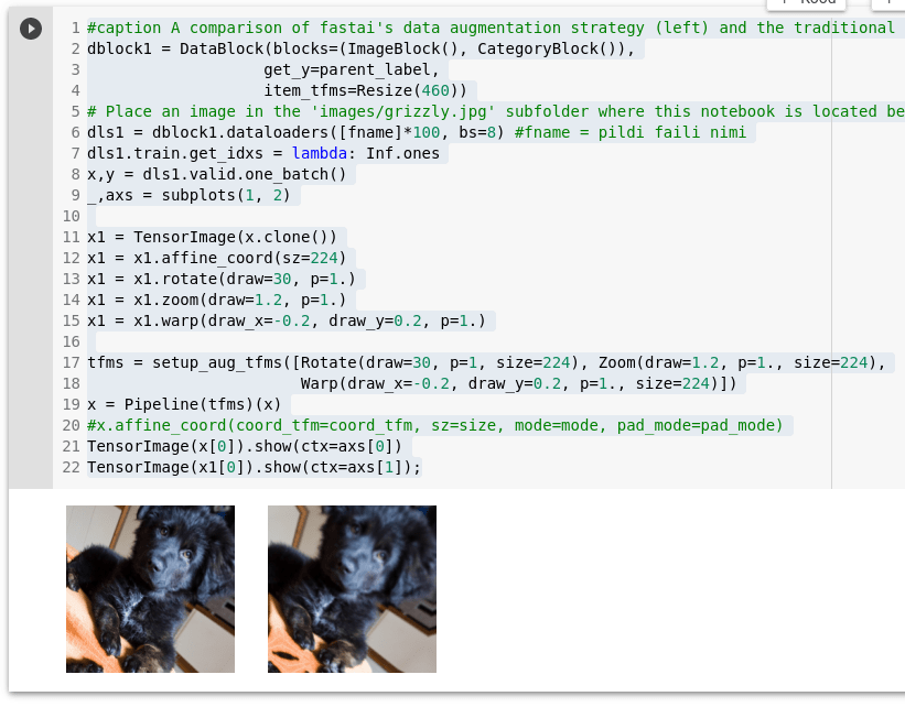 Näide tulemust kui, andmestiku täiendada fastai (vasakul) ja traditsioonilisel meetodil (paremal).