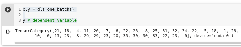 Partii (batch) suurus on 64: tensoris on 64 rida. Iga rida on number 0 ja 36 vahel. Numbrid tähistavad tõugu. Siin andmestikus on 37 tõugu.