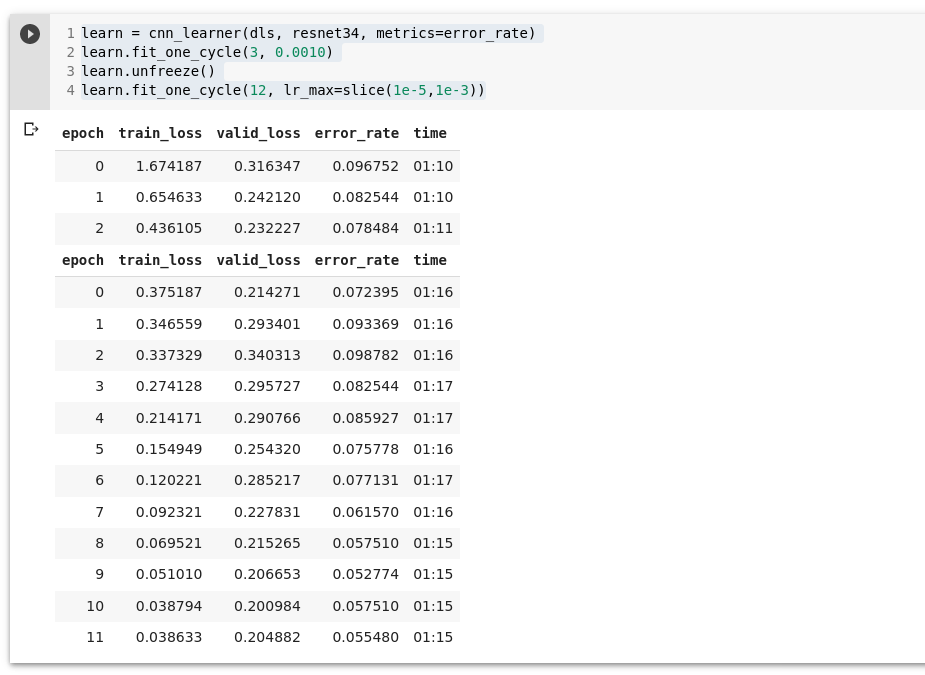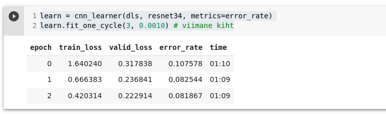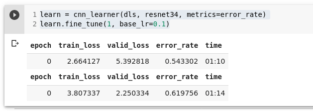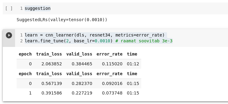 learn.fine_tune(2, base_lr=0.0010) # raamat soovitab 3e-3