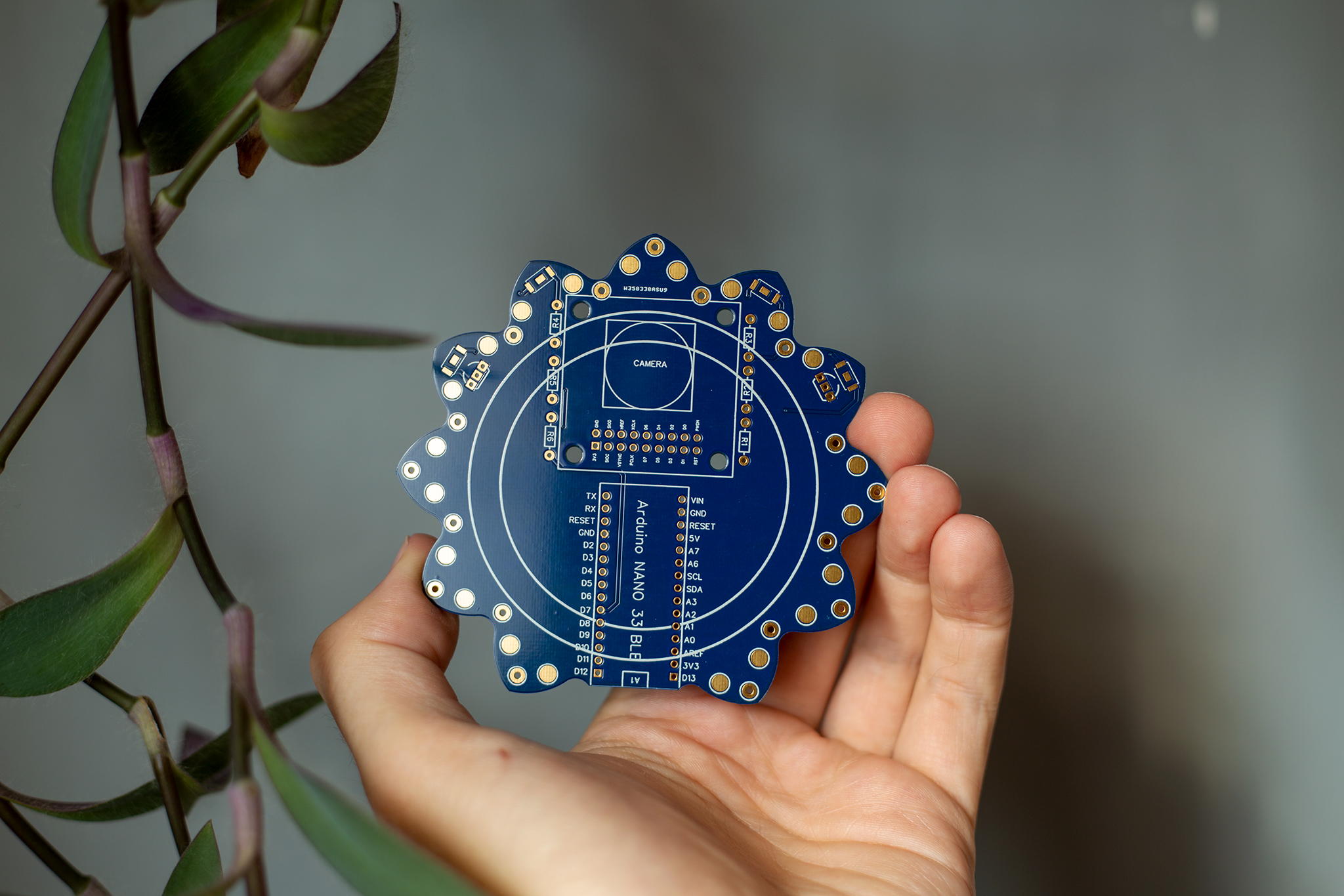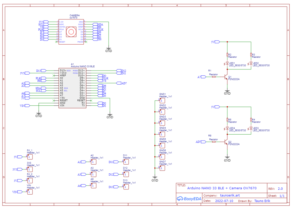 In spring I bought TinyML Cookbook and there are a lot of detailed examples of how to use machine learning on microcontrollers. So I designed this board to experiment with it. On this PCB, with is made by PCBWay, is room for Arduino Nano 33 Ble sense and OV7670 camera. I also added some LEDs to illuminate camera scenes if needed. And on the side are all the rest of the pins that I can use.