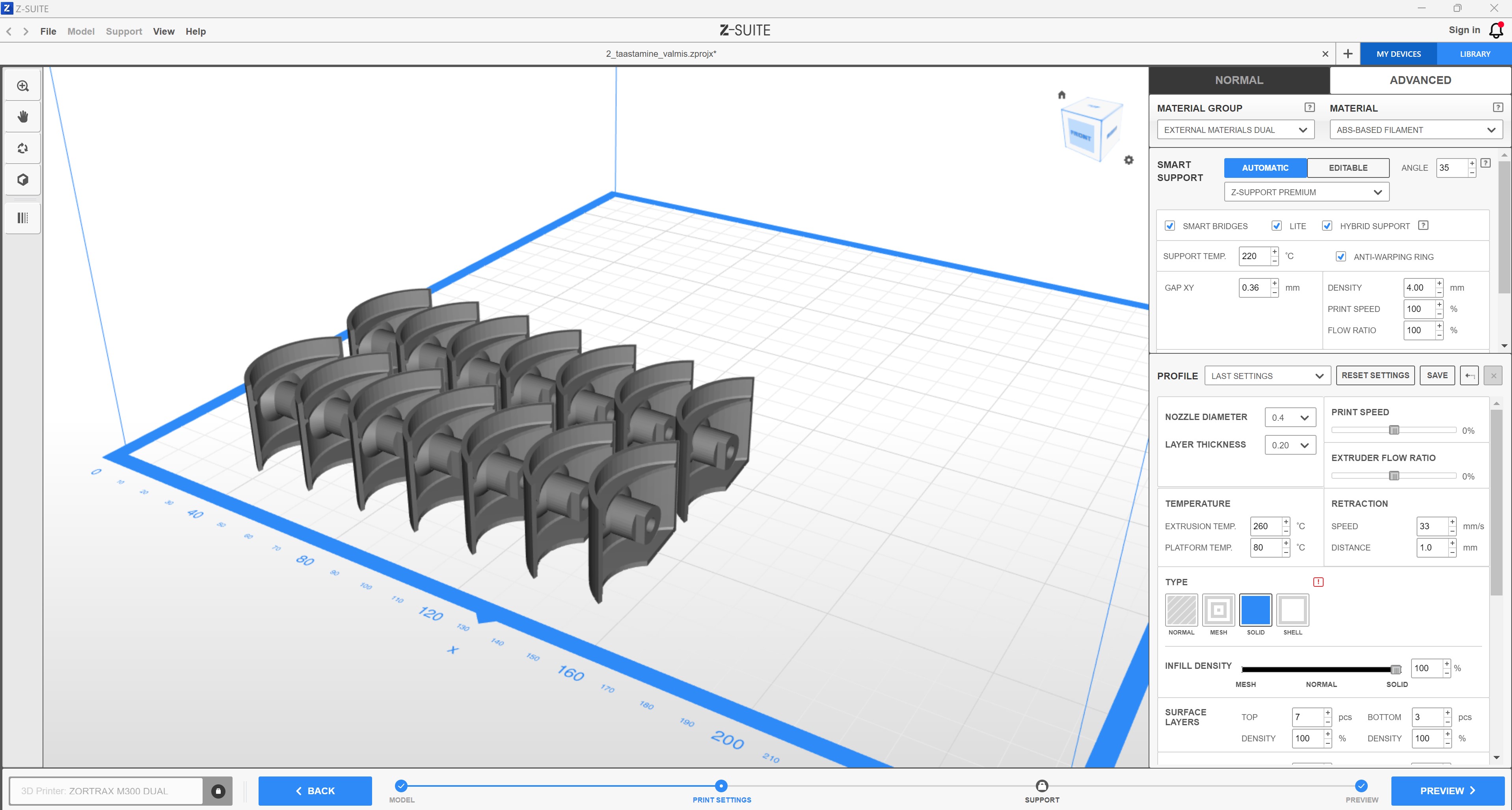 Enne 3D-printimist tasub mõelda, millist külge pidi panna objekt 3D-printerisse, kui palju on vaja tugimaterjali ja kuidas kihtide asetus mõjutab prinditud asja struktuurset tugevust. Kuna mul oli kasutada 3D-printer (Zortrax M300 Dual), kus on olemas eraldi vees lahustuv tugimaterjal, siis saaks teoreetiliselt printida ükskõik millist külge pidi.