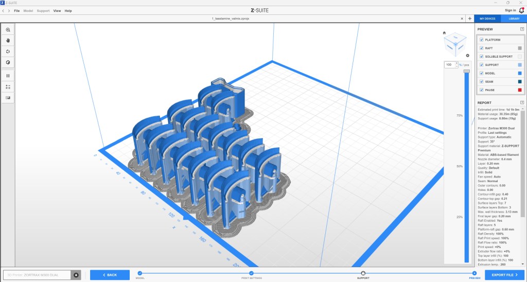 Valmis mudeli uuesti eksportimine stl-failiks, et saaks 3D-printida. Kõigepealt printisin ühe näidise ja vaatasin, kas vaatasin, kas on vaja mudelis teha muudatusi, seejärel printisin kogu tellimuse.