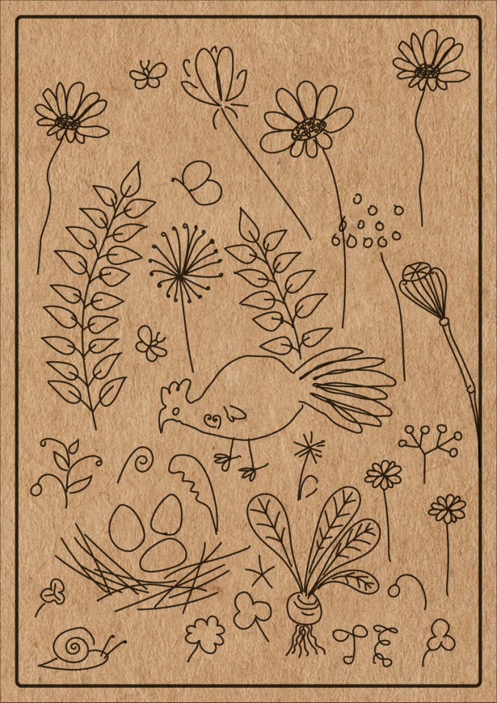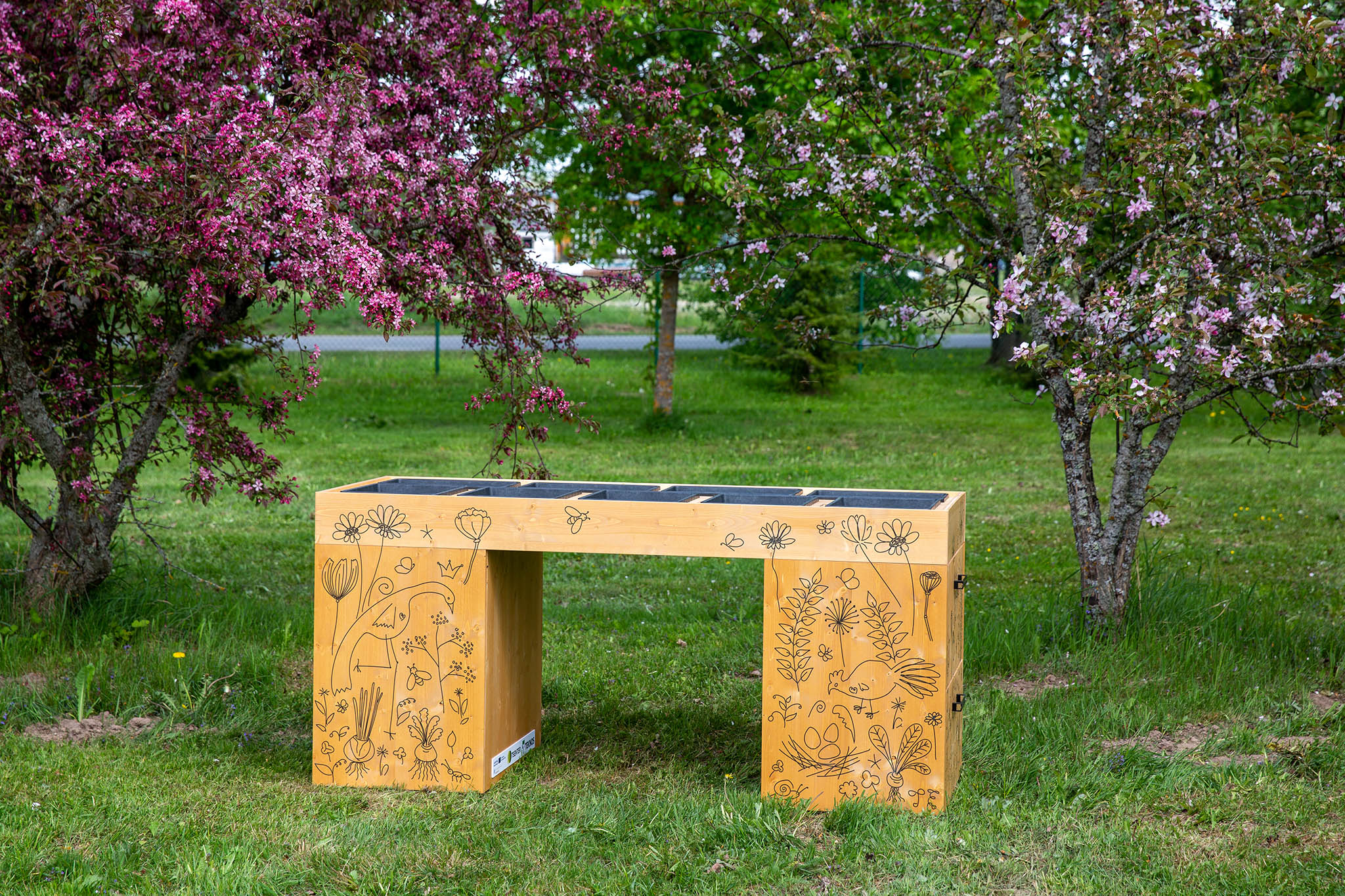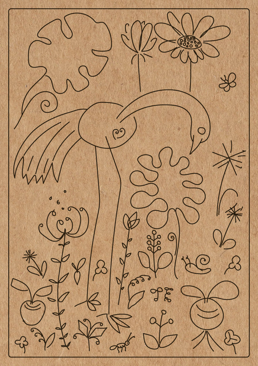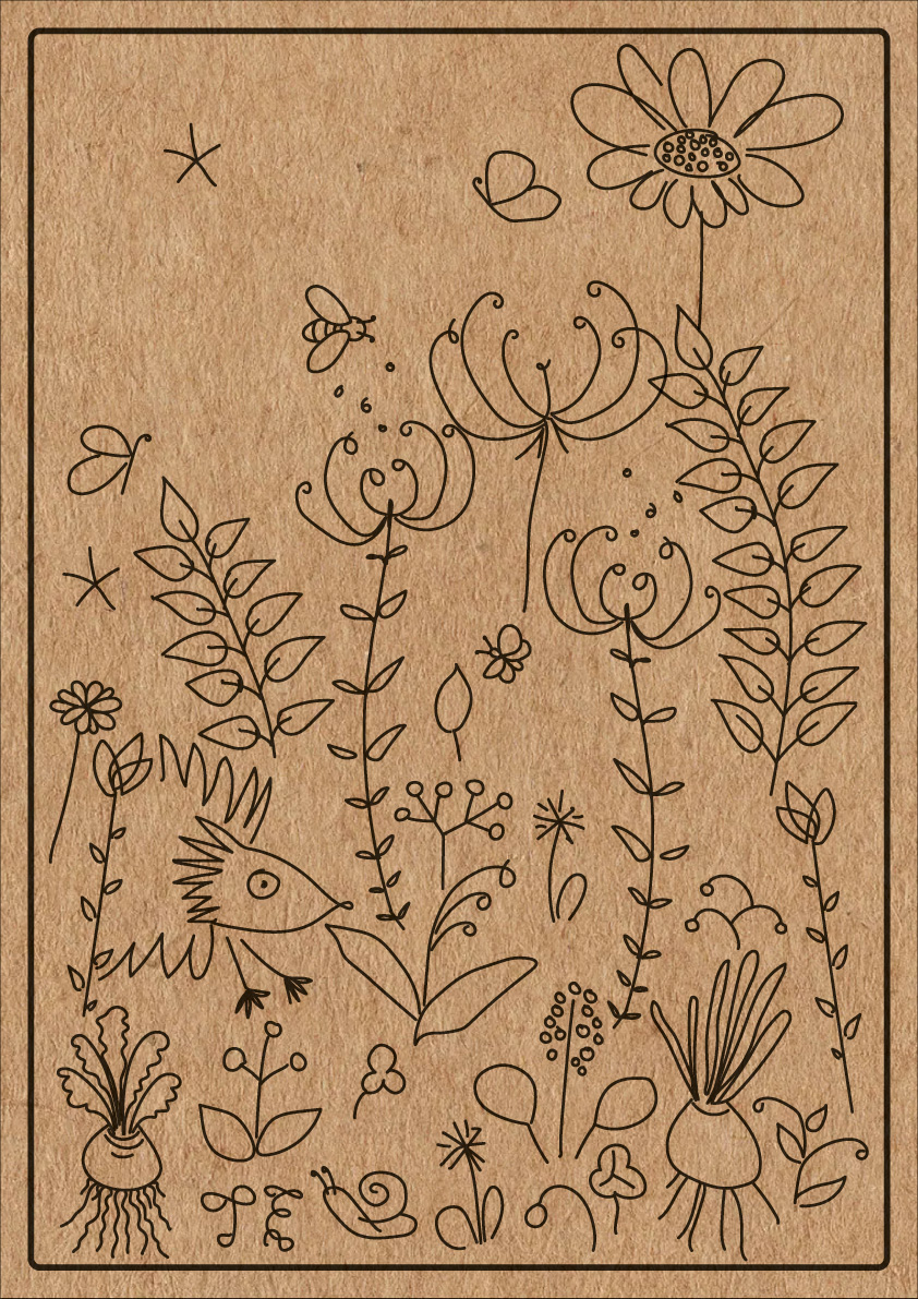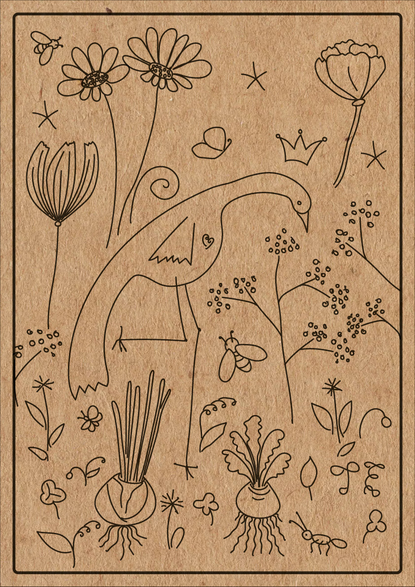 My drawings on this planting table. First I drew on paper. Then I drew over the vector format. Printed on wood.