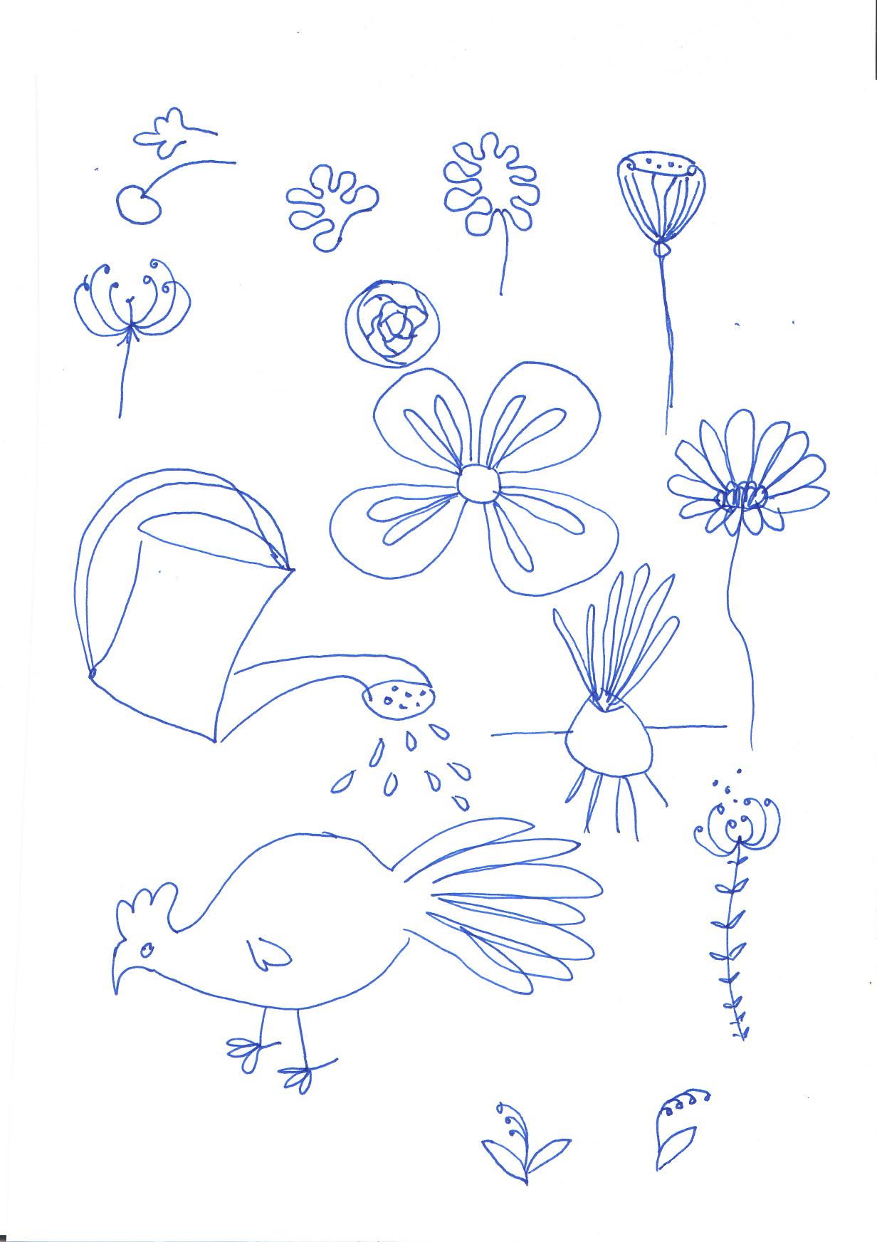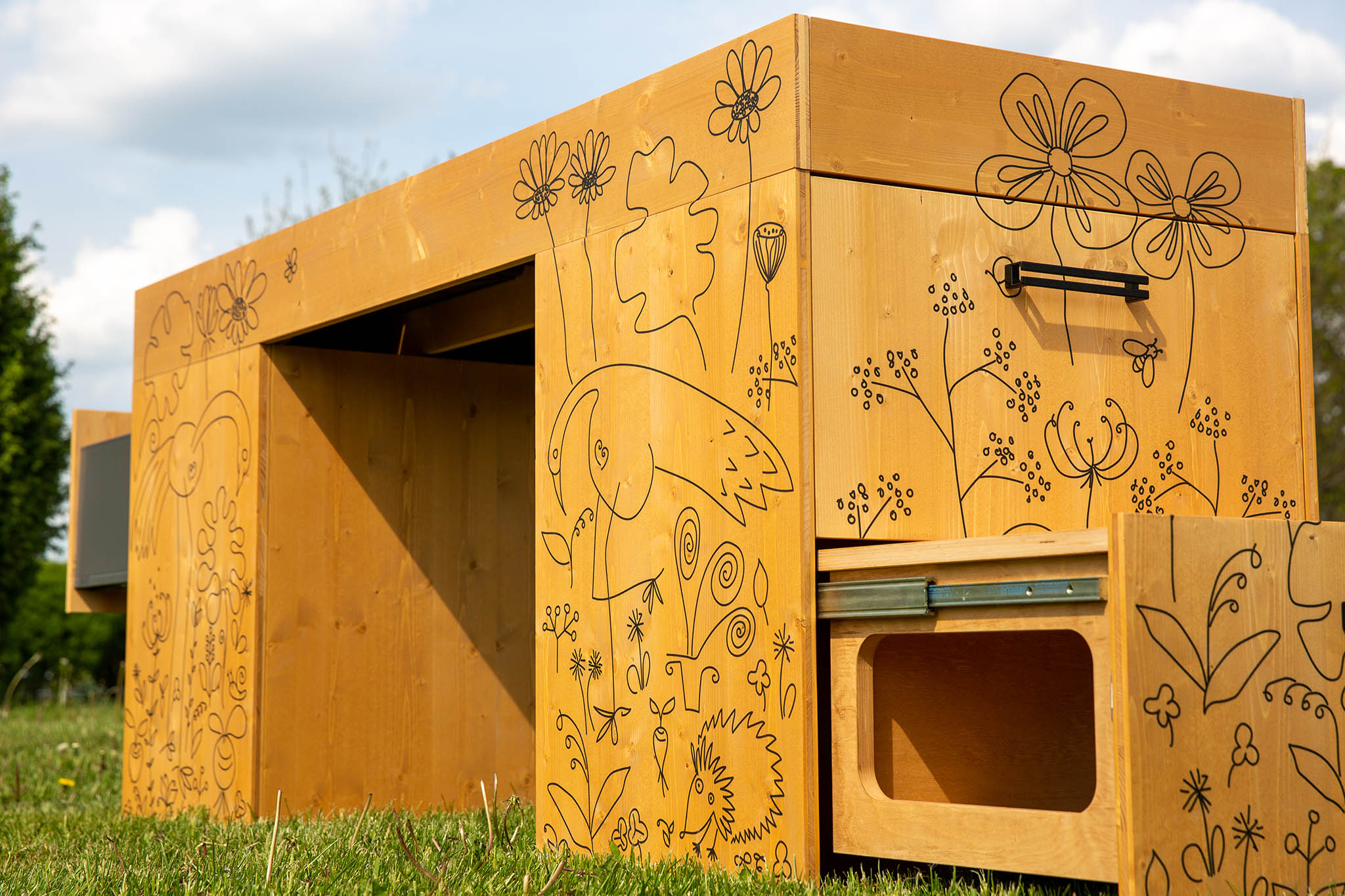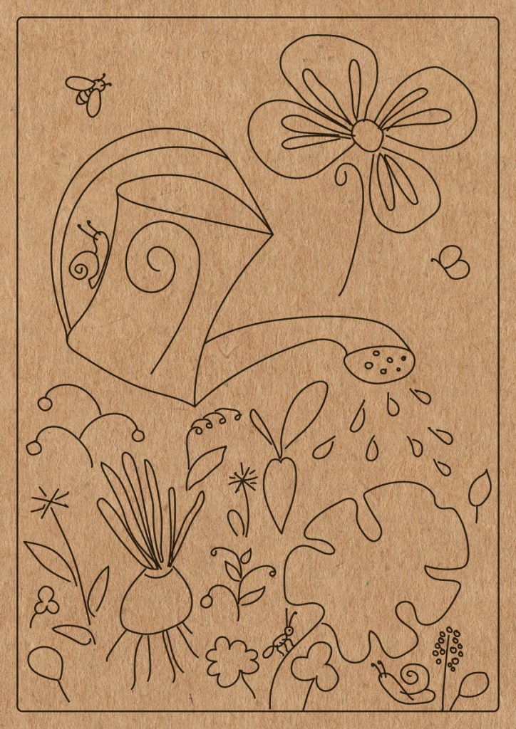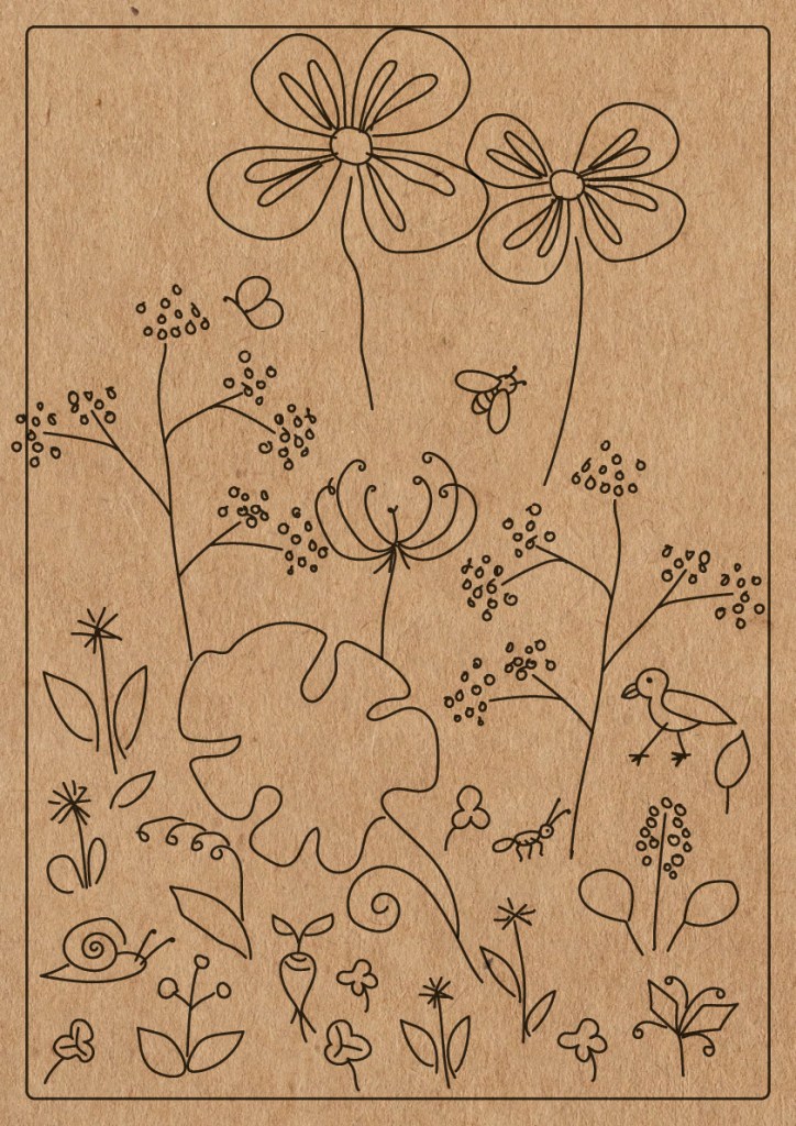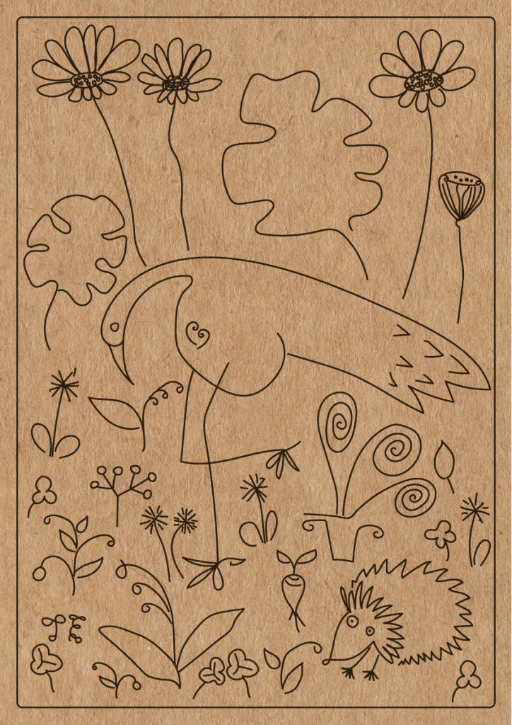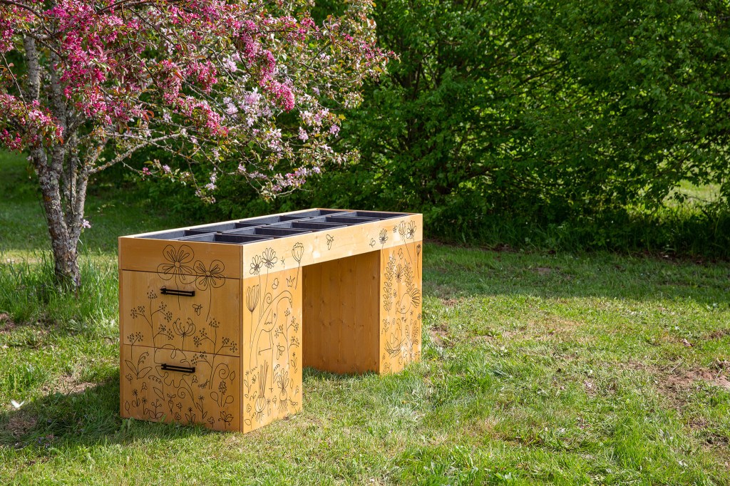 My drawings on this planting table. First I drew on paper. Then I drew over the vector format. Printed on wood.