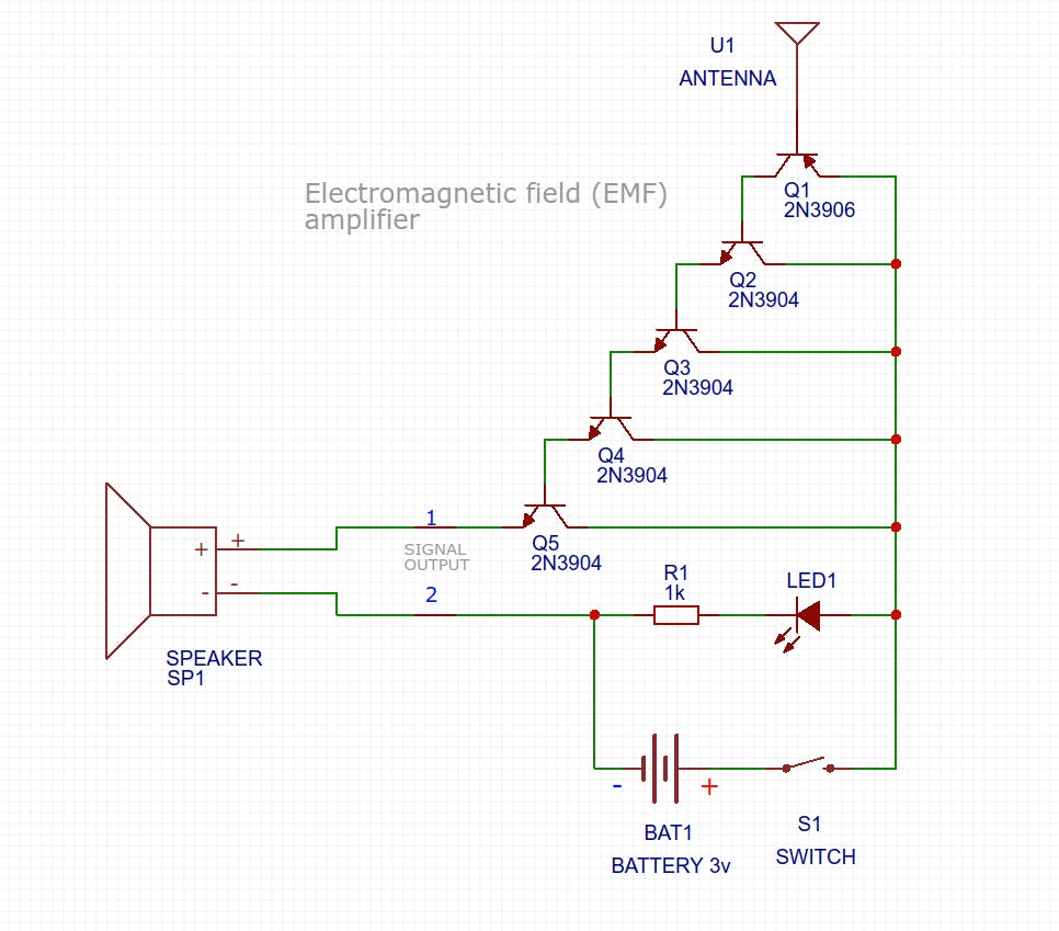 We can use this circuit to amplify the EMF what is produced by mains (AC) in our walls. A transistors acts as an amplifier by raising the strength of a weak signal. The antenna can be just a wire.